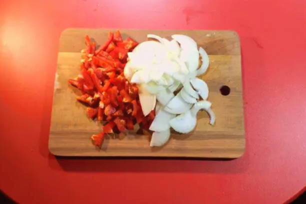 - Snijd uien in halve ringen, paprika in reepjes. Rasp de wortelen op een grove rasp.