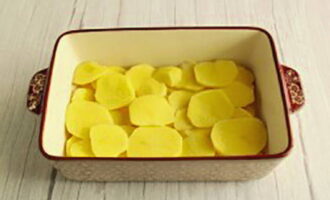 Was de aardappelen, schil en snij in dunne plakjes. Leg een laag aardappelen in een ovenvaste schaal, zout naar smaak.