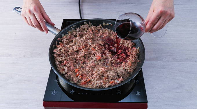 - Voeg vervolgens de tomaten, kaneel, oregano, zout en wijn toe. Roer en laat 25-30 minuten sudderen tot de vloeistof verdampt.