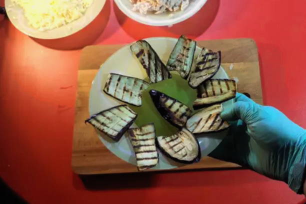 - Smeer de moussakaschaal in met olie.Leg een deel van de aubergine in de eerste laag, dan aardappelen, dan gebakken groenten met kip.