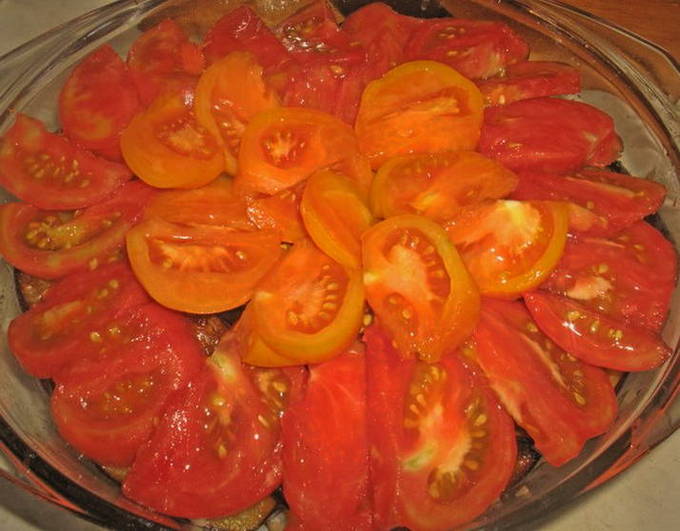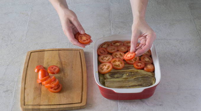 - Vet een ovenschaal in met plantaardige olie. Leg er een laag tomaten in en vervolgens een laag gebakken aubergine.