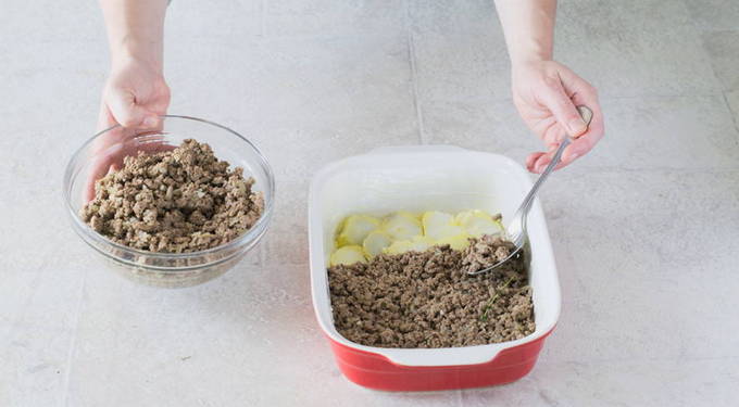 - Bestrijk een ovenschaal met olijfolie. Leg de helft van de courgettes en aardappelen op de bodem. Verdeel de vleesmassa erover, bedek het met de resterende courgette. Giet de witte saus over de blanco.