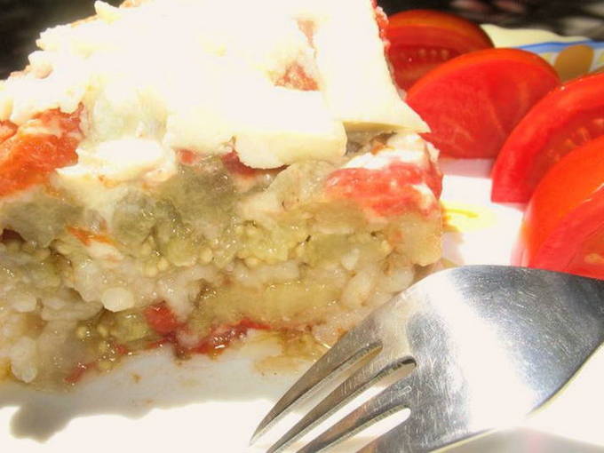 Heerlijke moussaka met rijst, aubergine en tomaat