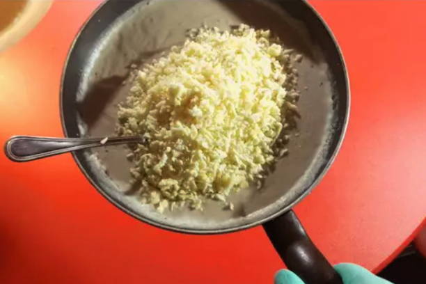 Rasp de kaas op een middelgrote rasp. Klop de eieren los met een garde. Smelt de boter in een koekenpan, voeg bloem toe, meng goed en bak goudbruin.