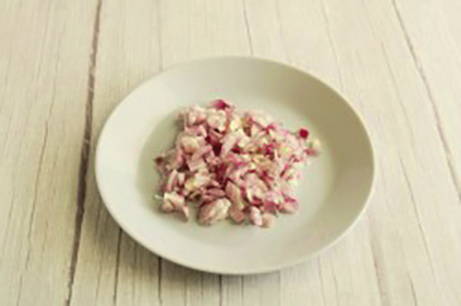 - Kook de kipfilet in gezouten water, koel af en snij in kleine blokjes.