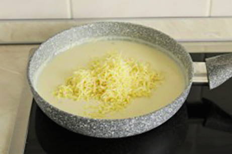- Smelt de boter in een andere pan, voeg bloem toe, bak goudbruin. Giet vervolgens geleidelijk de melk erbij en roer de saus tot een gladde massa. Voeg dan de geraspte kaas toe.