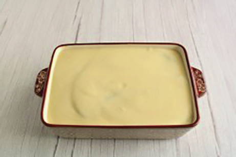- Meng de yoghurt en ricotta apart, voeg de nootmuskaat, zwarte peper, ei en zout toe en meng goed. Giet de saus in de vorm, voeg geraspte kaas toe.