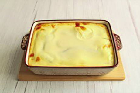 - Klop eieren met bloem. Voeg geleidelijk melk toe, roer tot een gladde massa. Giet de saus over de moussaka en zet deze 10 minuten terug in de oven, maar zonder deksel.