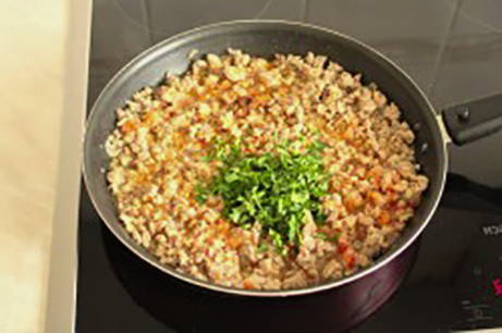 Bak de uien in een koekenpan tot ze zacht zijn, voeg dan het gehakt toe en bak nog 3-5 minuten. Voeg daarna de tomatenmassa en wijn toe, roer en laat 10 minuten onder het deksel sudderen. Voeg peterselie, kaneel, zout en gemalen peper toe. Laat sudderen tot de vloeistof volledig is verdampt.