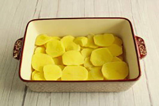 Was de aardappelen, schil en snij in dunne plakjes. Leg een laag aardappelen in een ovenvaste schaal, zout naar smaak.