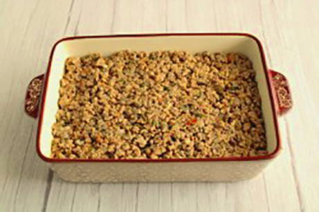 - Bak het gehakt in plantaardige olie samen met uien, zout en breng op smaak. Leg de vleeslaag op de aubergine.