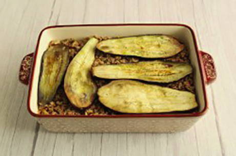 - Giet er wat van de saus bij, voeg dan de resterende aubergine toe en giet de resterende saus erbij.