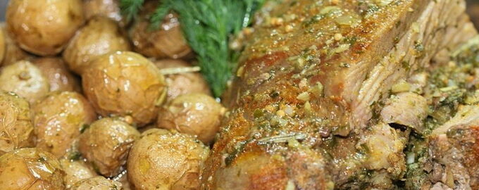 Sappig, lekker en mals varkensvlees dat in een heel stuk in de oven is gebakken, staat prachtig op een feestelijke tafel. Het snijden van dergelijk vlees kan worden geserveerd