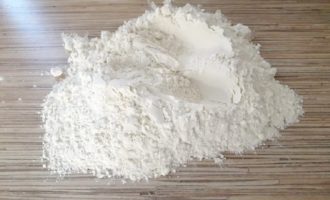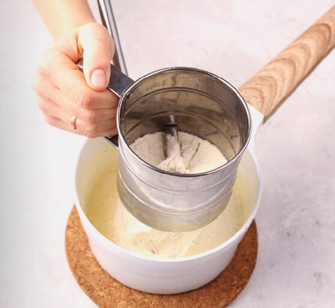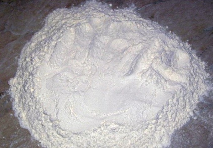 - Zeef het tarwemeel door een zeef en strooi het op het werkblad van de tafel.