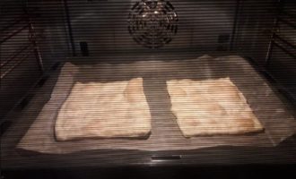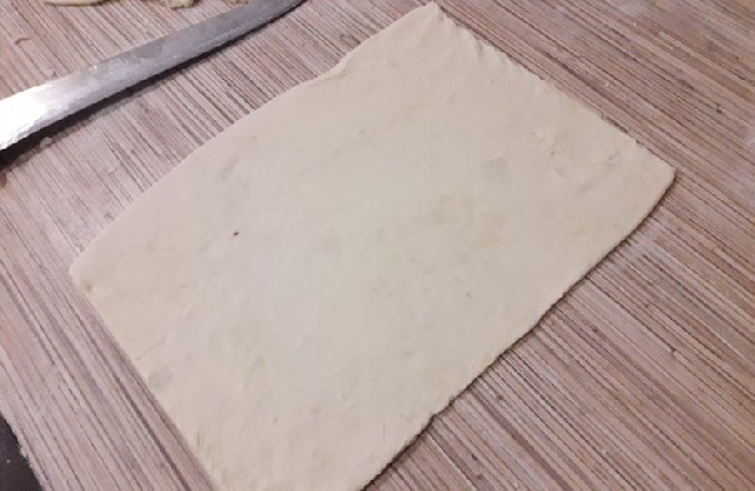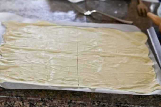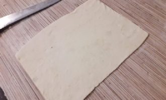 - Ontdooi het bladerdeeg vooraf. Spreid een vel uit op een met bakpapier beklede bakplaat en rol het met een deegroller uit tot een dikte van 1-1,5 mm.