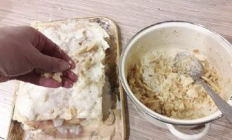 - Bedek elke laag "oren" goed met de voorbereide room. Leg op deze manier alle koekjes en room neer. De laatste laag moet crème zijn. Van de hoeveelheid koekjes en room die in het recept wordt vermeld, moet u een cake met 4 lagen maken.