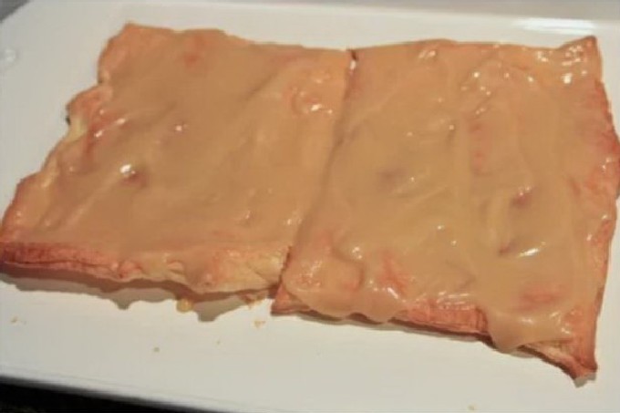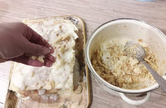 - Leg de gebakken cakes in een stapel op een grote schaal, vet elke korst eerst in met vla en daarop met zure room. Vet de bovenste cake niet in met room.