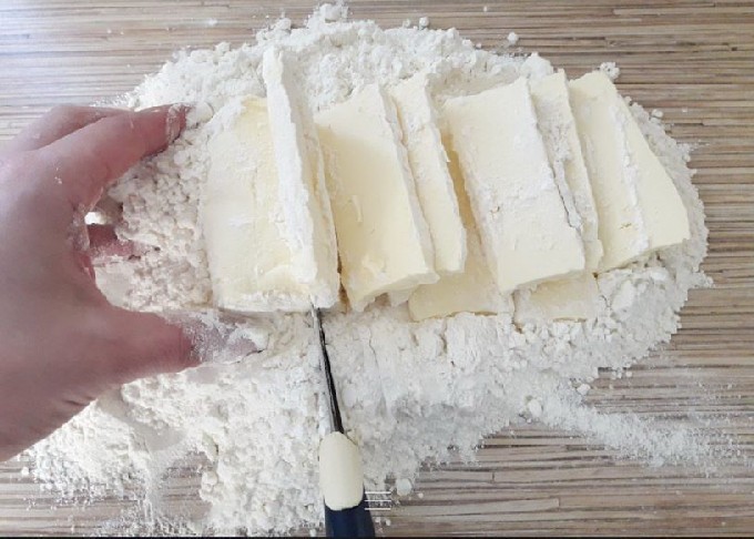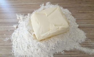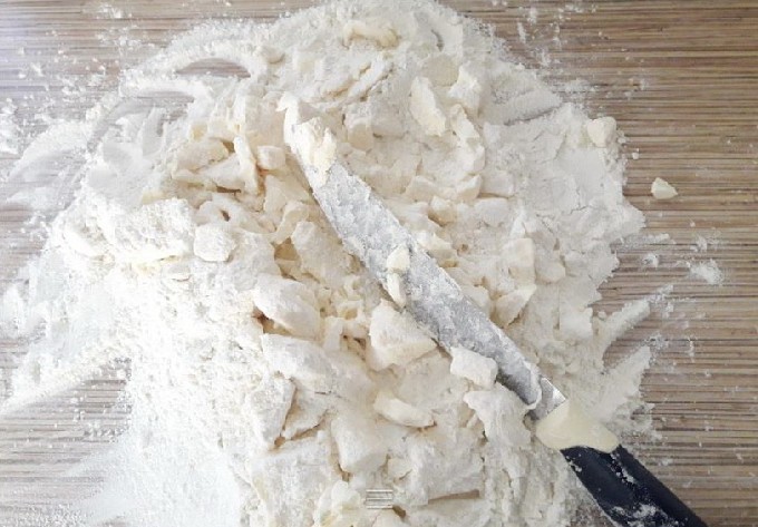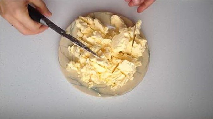 - Meestal wordt voor het deeg boter samen met bloem gehakt met een gewoon mes. Maar in dit recept wordt u aangemoedigd om het te koken met een blender of keukenmachine. Leg de koude boter op een plat bord en snij met een mes in grote stukken.