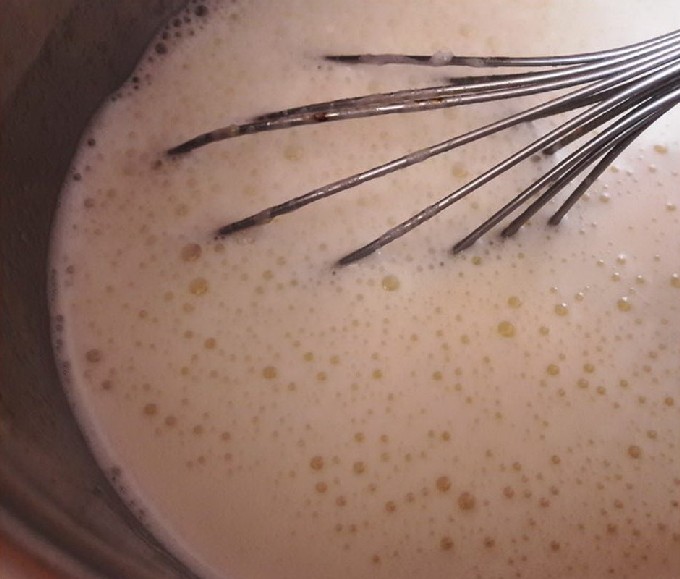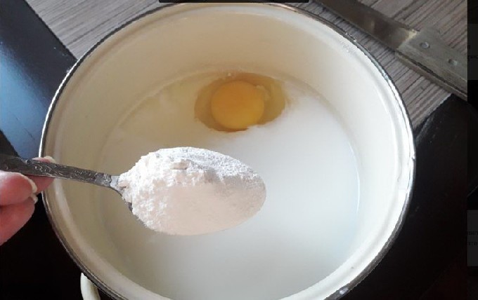 - Giet de rest van de melk (300 ml) in een kleine kom, voeg de eieren toe, de hoeveelheid bloem, zetmeel en vanilline die in het recept staat aangegeven en mix alles met een garde tot een glad beslag.