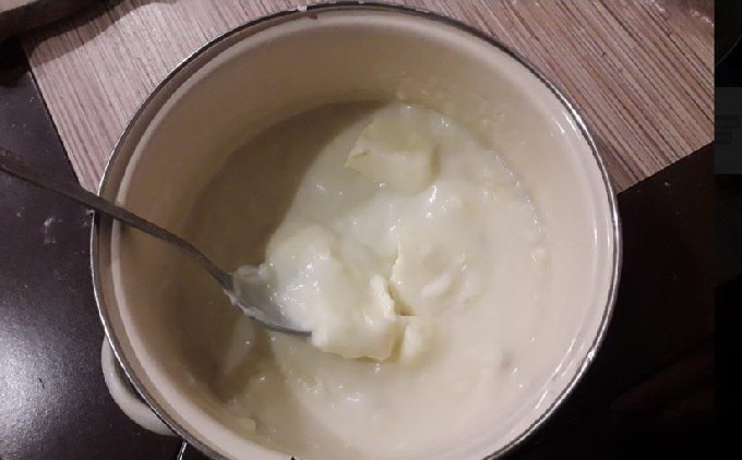 - Giet het bereide mengsel in een dunne stroom in kokende melk en kook onder voortdurend roeren tot het ingedikt is. Haal vervolgens de pot met room van het fornuis en laat afkoelen tot normale huistemperatuur.
