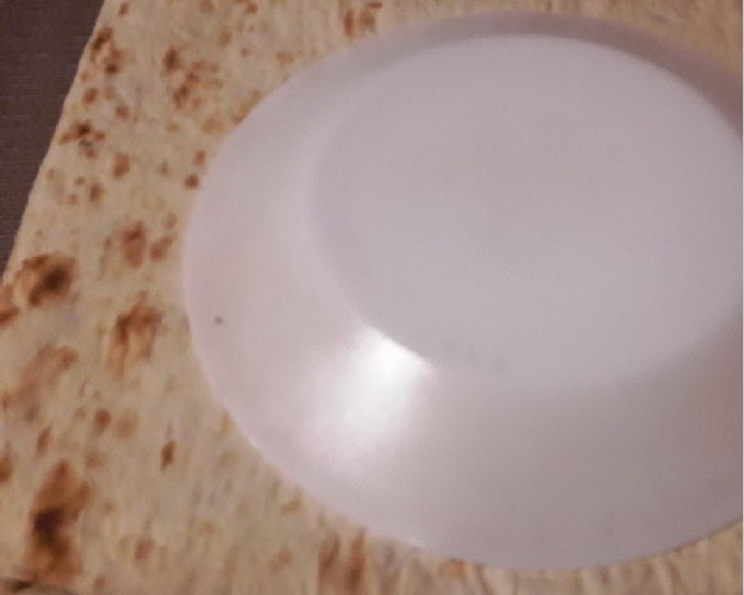 - Rol elk broodje met een deegroller op een vel bakpapier tot een dunne cake van 3-4 mm dik (je kan nog dikker). Snijd van de tortilla's de cirkels op maat en vorm van het grote bord.