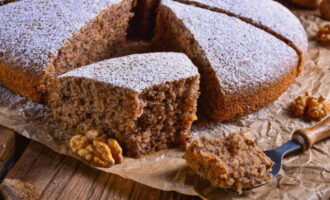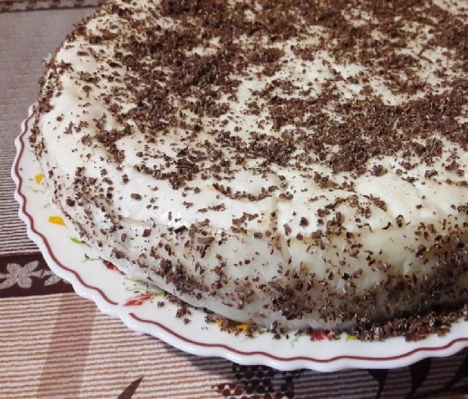- Haal 's morgens de cake uit de vorm, plaats deze op een mooie schaal en decoreer met geraspte chocolade, noten of gedroogd en gehakt pitabroodje.