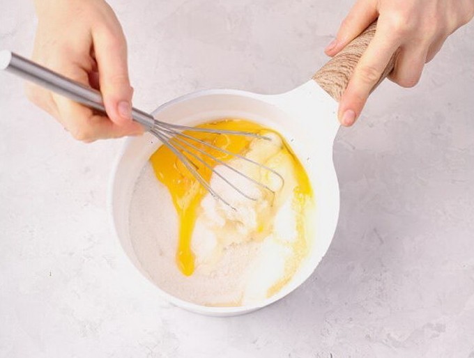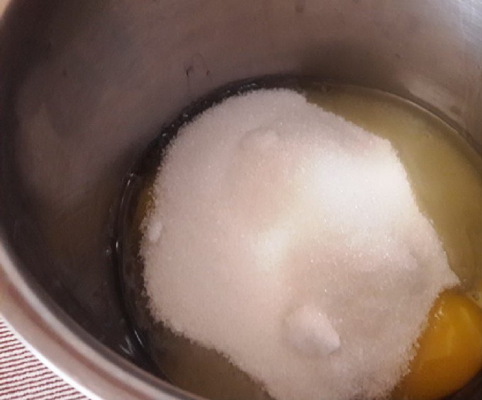 - Eerst moet je een custard maken voor de cake. Om dit te doen, breek de kippeneieren in een aparte pan, voeg bruine en witte suiker toe.