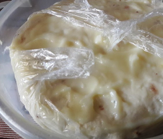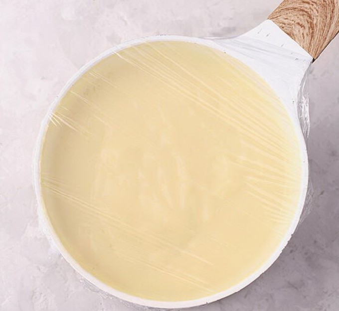 - Doe een klein stukje boter in de bereide room en roer. Dek de pot af met plasticfolie en laat volledig afkoelen.