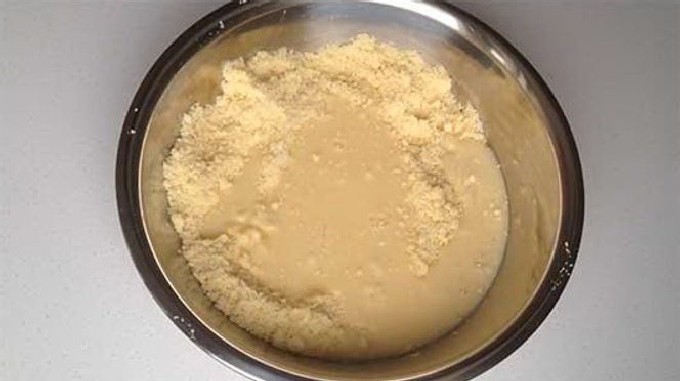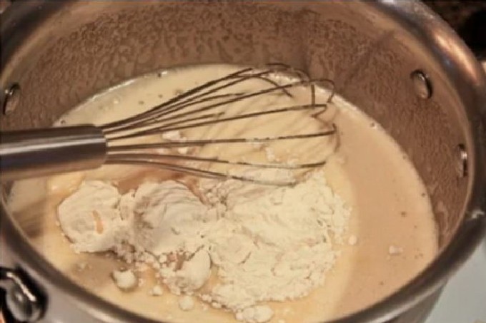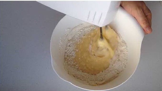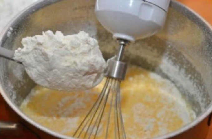 - Giet melk bij het mengsel, roer opnieuw en voeg twee eetlepels bloem toe.