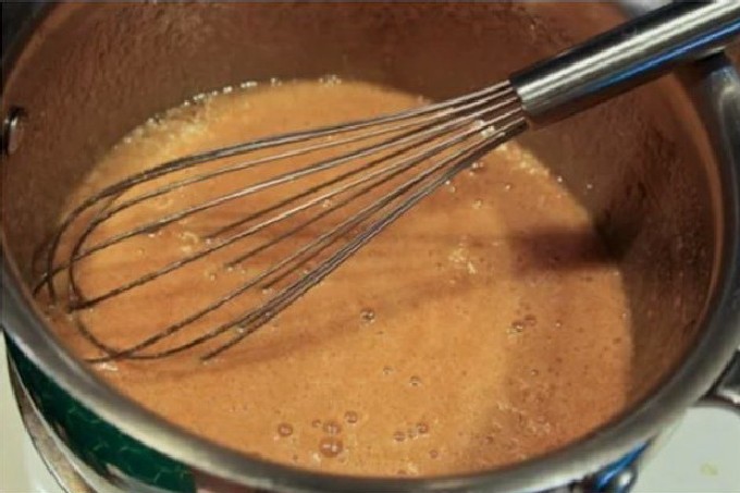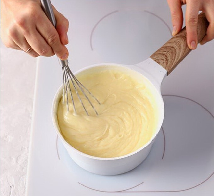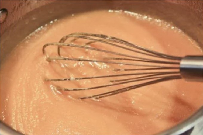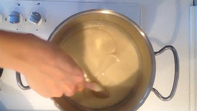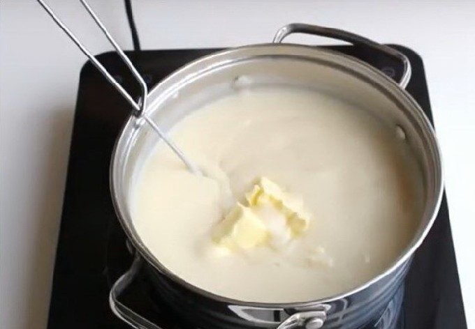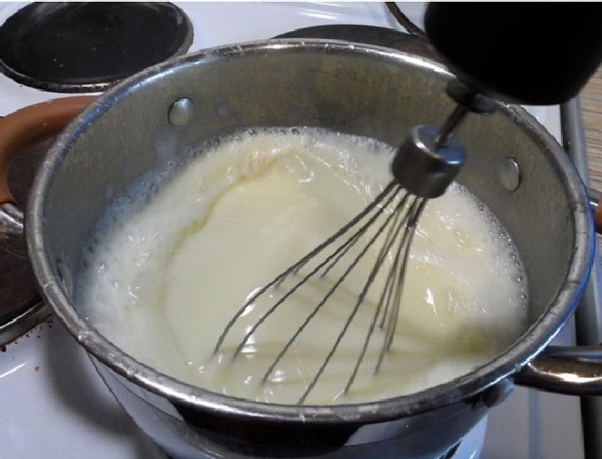 - Giet het resulterende mengsel in een pan en kook de room onder voortdurend roeren met een garde op laag vuur tot hij volledig is ingedikt.