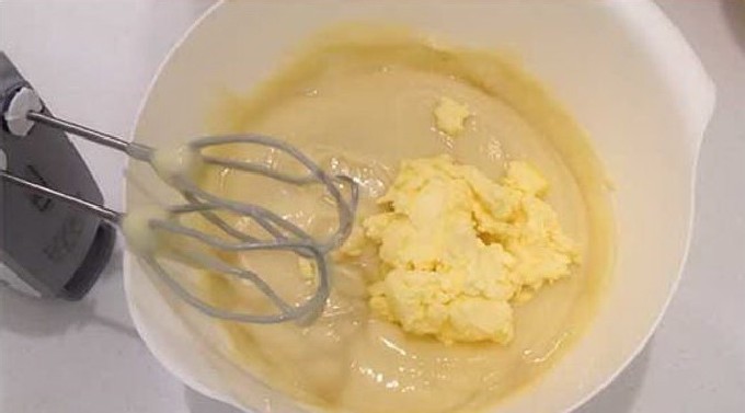 - Giet de gekoelde custard in een blenderkom, voeg de benodigde hoeveelheid boter toe en klop tot een witte luchtige massa.