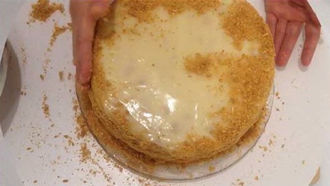 - Nu kun je "Napoleon" verzamelen. Plaats hiervoor de cakes op een vlakke plaat en vet elke cake in met de voorbereide room. Vet ook de zijkanten van de cake en de bovenste laag in met room.