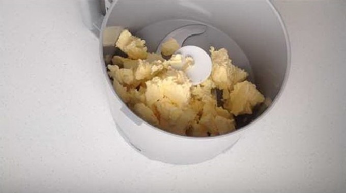 - Giet de benodigde hoeveelheid gezeefde bloem in de kom. Maal op de hoogste snelheid van het apparaat de bloem en boter tot kleine kruimels.