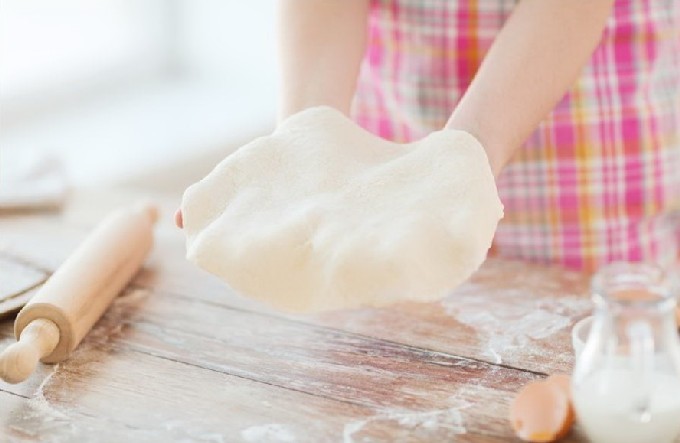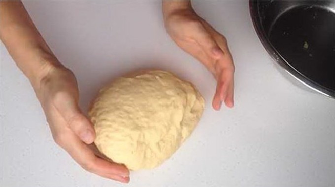 - Kneed het deeg vervolgens snel, til het van alle kanten naar het midden op, vouw het in lagen en druk het met je handen aan. Dit deeg wordt niet op de gebruikelijke manier gekneed.