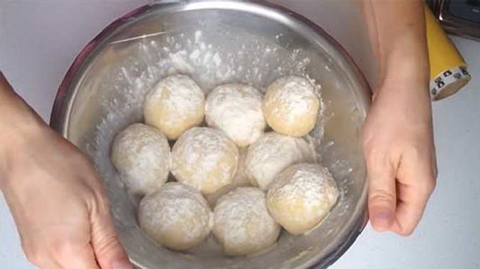 - Haal na deze tijd het deeg uit de koelkast, snijd het in 7 identieke stukken, rol er balletjes van en bestrooi een beetje met bloem.