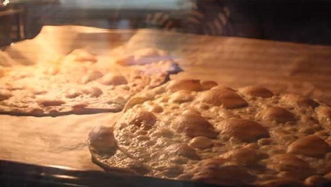- Verwarm de oven voor op 190-200 ° en bak alle opgerolde cakes afwisselend in 3-5 minuten goudbruin. Om grote luchtbellen te voorkomen kun je met een vork op meerdere plekken in de taarten prikken. Je hoeft dit niet te doen, dan wordt het deeg meer gelaagd.