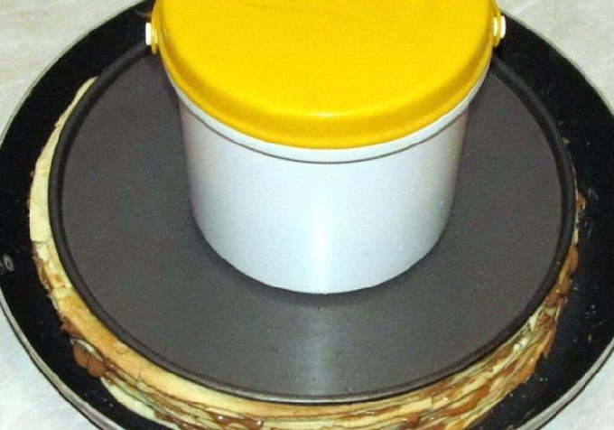 Vouw de gebakken cakes in een stapel op een apart bord en snij de randen gelijkmatig met een mes, laat de gesneden stukjes om te bestrooien. Plaats de cakes op een taartvormplaat en vet elke korst royaal in met gekookte custard.