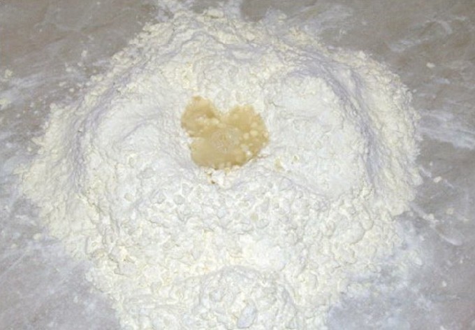 - Gekoelde romige margarine, voorzichtig om niet op tafel te vallen, rasp op een grove rasp onmiddellijk tot bloem. Meng alles en maak een klein kuiltje in het midden van deze massa.