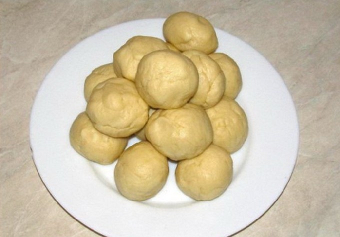 Maak een gat in een glaasje gekookte kruimels en giet het mengsel van eieren en water er in porties (beetje bij beetje) in, terwijl je het resulterende deeg met je handen in één klontje verzamelt. Kneed het deeg niet, maar verzamel het in een grote klont.