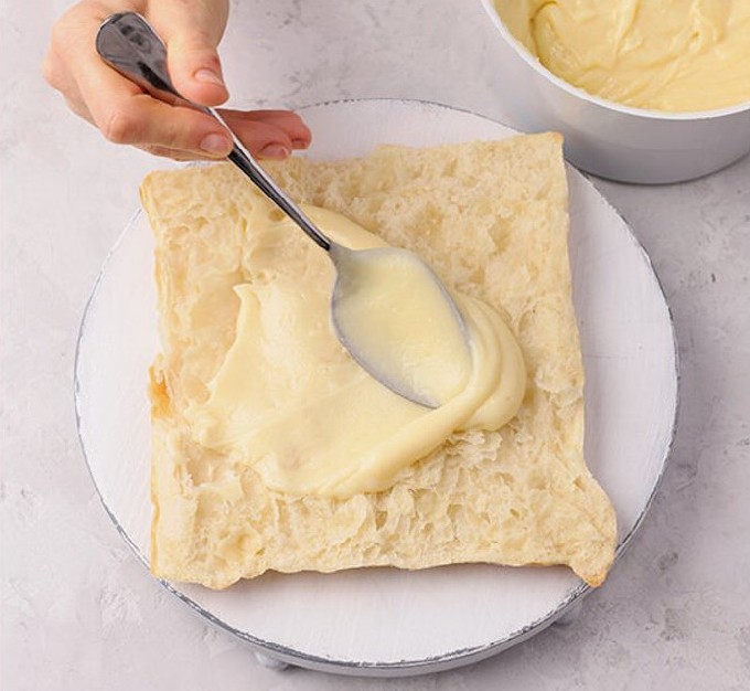 - Breng een laag crème aan op de bodem van de vorm en plaats de eerste korst.