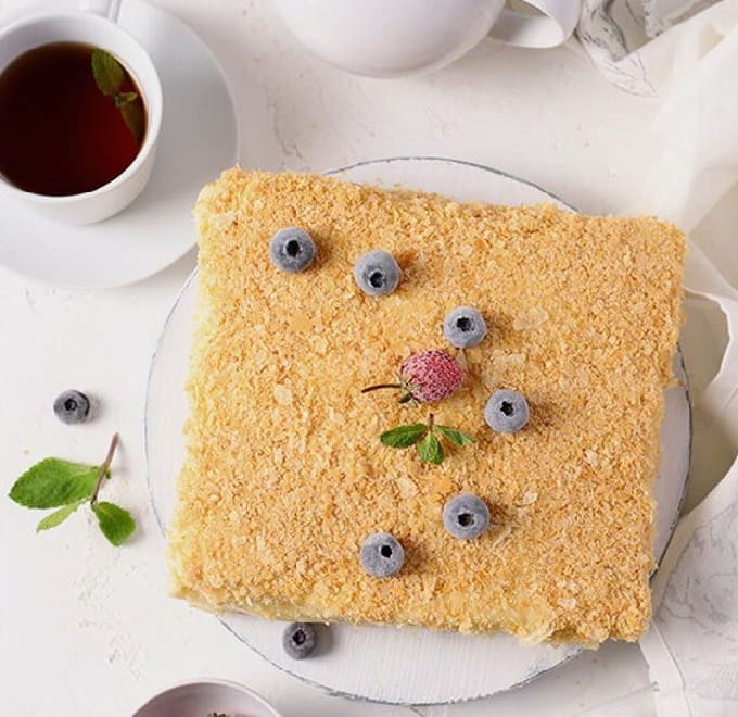 - Strooi de kruimels gelijkmatig over de cake. Serveer deze Napoleon bij de koffie of thee.