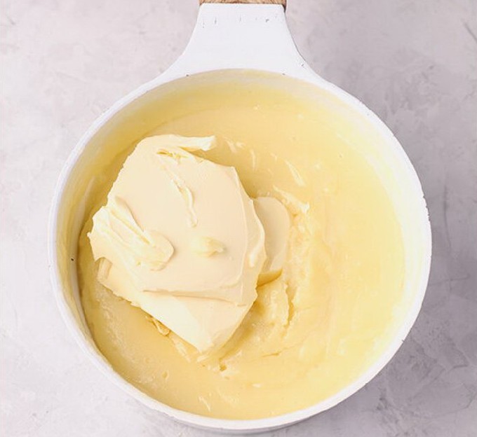 - Wanneer er kleine belletjes op het oppervlak van de room verschijnen, doe dan boter in een kom en roer de room zodat de boter oplost en de room begint in te dikken.