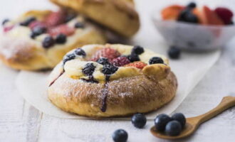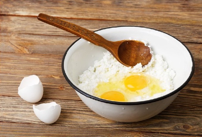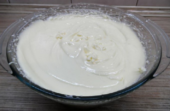 - Klop eieren tot kwark, voeg suiker, vanilline toe en voeg boter toe die op huistemperatuur is verzacht. Pureer al deze ingrediënten met je hand en laat het resulterende mengsel 20 minuten staan.