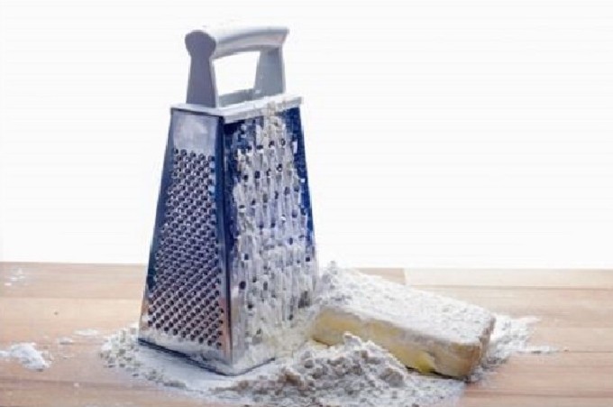 - Zeef het tarwemeel door een zeef en strooi het op een hoopje op het werkblad van de tafel. Rasp voorbevroren margarine of boter op een grove rasp direct tot bloem. Om ervoor te zorgen dat de boter gemakkelijker te wrijven is en niet smelt, dompelt u deze regelmatig in bloem.