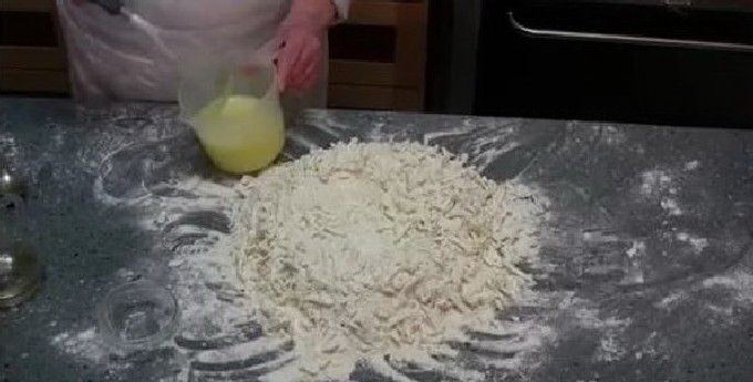 - Breng de resulterende kruimel over naar een ander gerecht, voeg koud water, zure room, een ei, wodka en zout toe en kneed het deeg tot het glad is, zodat het niet aan je handen blijft plakken.