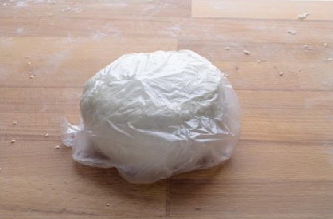 - Vorm het voorbereide deeg tot een rechthoek of klomp, wikkel het in een stuk huishoudfolie en plaats het 2 uur in de koelkast, of beter een nacht. Je kunt dit deeg invriezen of meerdere dagen in de koelkast bewaren.