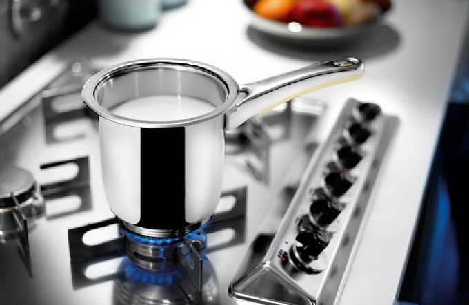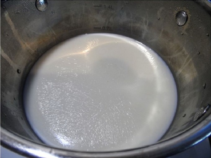 - Om de room te bereiden, spoelt u een aparte pan met koud water, schenkt u er 1,2 liter melk in en brengt u deze op laag vuur aan de kook.