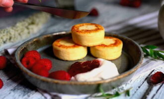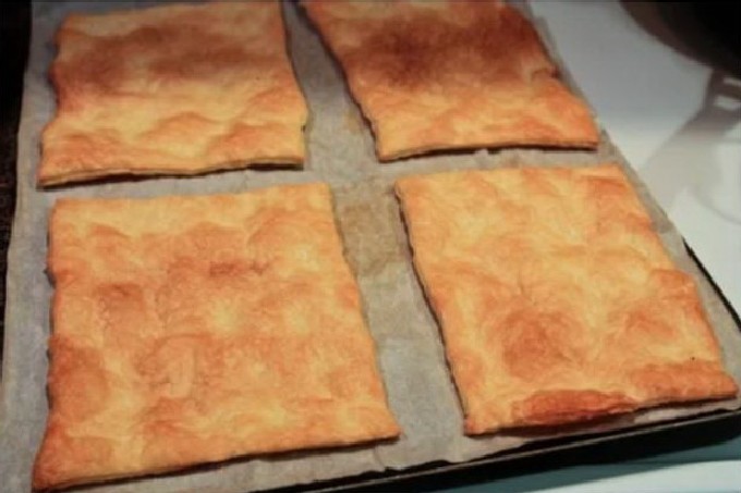 - Bak de cakes in 10-15 minuten goudbruin. Leg de gebakken cakes, voorzichtig om niet te breken, met een brede spatel op een grote schaal en leg dan het tweede vel deeg op de bakplaat. Herhaal het bakproces.
