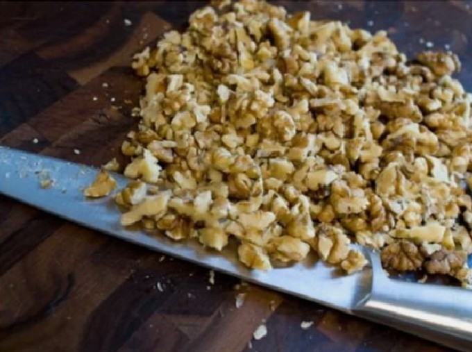 - Hak de gepelde walnoten fijn met een mes of deegroller en meng met het kruim van de deegresten.