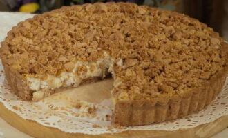 - Bak de overige deegstukken in de oven, laat afkoelen en hak ze met een mes in kruimels. Strooi het dan over de taart.